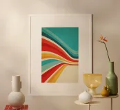 Sensazione di viaggio astratto-visivo: questo poster rende omaggio al design retrò degli anni '70 e le sue curve dinamiche di colore ricordano le autostrade infinite, la libertà e l'agio californiano. La texture volutamente invecchiata aggiunge un fascino nostalgico, mentre il gioco di turchesi, rossi e gialli solari porta un'energia ottimistica in qualsiasi ambiente, ideale sia per spazi di lavoro creativi che per pareti di soggiorni eleganti.