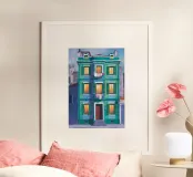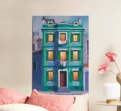 Un edificio a più piani con finestre luminose è rappresentato nei toni del blu profondo e del turchese, evocando il mistero e il fascino della vita urbana notturna con un'estetica fresca e moderna.