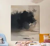 Un dipinto astratto d'atmosfera che mostra un drammatico assembramento di nuvole temporalesche in grigi scuri, neri e blu profondi, con un accenno di luce che irrompe, suggerendo una pioggia imminente o una potente forza naturale.