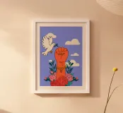 Un pugno alzato con sopra una colomba che vola, circondata da fiori e nuvole, su uno sfondo viola.