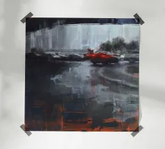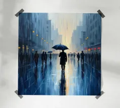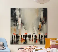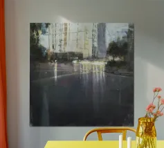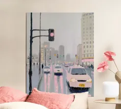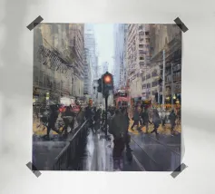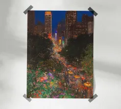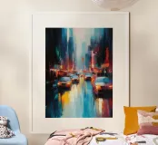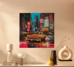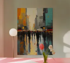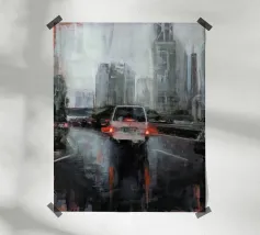 Uno straordinario dipinto astratto di un vibrante paesaggio urbano notturno, caratterizzato da fari di auto incandescenti e riflessi colorati sulle strade bagnate. Le pennellate dinamiche e le tonalità ricche catturano l'energia della vita urbana.