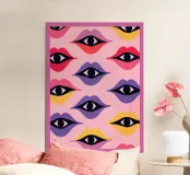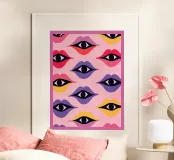 Illustrazione surreale di occhi e labbra con motivi pop art colorati e audaci forme geometriche.