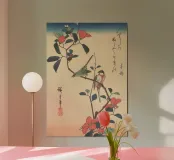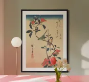 Utagawa Hiroshige - Occhio bianco giapponese e cinciallegra su un ramo di camelia | Delicata stampa naturalistica di epoca Edo. L'occhio bianco giapponese e la cinciallegra su un ramo di camelia di Utagawa Hiroshige è una raffinata e delicata stampa ukiyo-e su xilografia che mostra due uccelli che riposano tra fiori di camelia in fiore. Questo pezzo del periodo Edo è un bellissimo esempio di kachō-ga (stampe di uccelli e fiori), che fonde una composizione serena con una squisita attenzione ai dettagli naturali. La maestria di Hiroshige offre uno sguardo tranquillo sulla natura e sull'estetica giapponese.