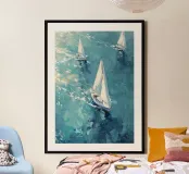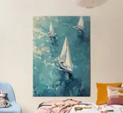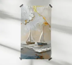 From a lofty vantage, a small fleet of sailboats glides across a sea of textured blues, each vessel carving foamy trails in sun-dappled waters. Bold impasto strokes capture the energy of wind-filled sails and shifting currents. “Ocean Parade” invites you to join the rhythmic voyage of exploration and freedom, where every wave tells a story.