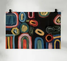File di forme a U e punti ripetuti nei colori giallo, arancione, blu e verde della terra evocano la sensazione di un boschetto o di un campo disegnato in questa intricata opera astratta.
