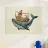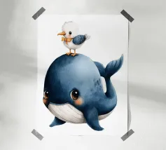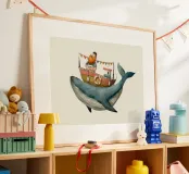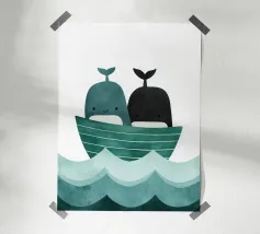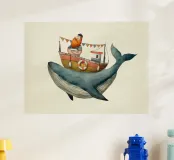 Un poster stravagante con un marinaio barbuto su un peschereccio colorato trasportato da una balena gigante. Questa affascinante opera d'arte nautica in stile acquerello aggiunge un tocco di fantasia e narrazione alle camere dei bambini, alle case al mare o agli interni ispirati all'oceano.