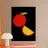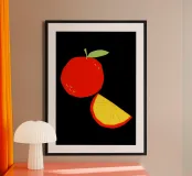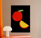 I colori rossi e gialli brillano su una fetta d'arancia. Il design semplice e deciso enfatizza le tonalità vivaci e la sensazione di freschezza del frutto.