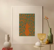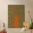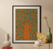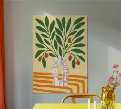 Un vaso arancione stilizzato trabocca di rami e foglie astratte su un solido sfondo verde. La disposizione crea un motivo simmetrico e armonioso, evocando un senso di natura ed equilibrio.