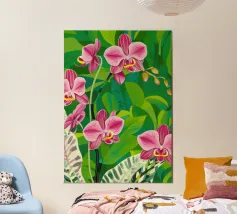Delicati ed eleganti fiori di orchidea con petali dettagliati nei toni del rosa, del giallo e del viola, su uno sfondo di ampie foglie verdi, che ne catturano la raffinata bellezza.