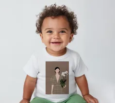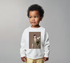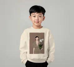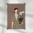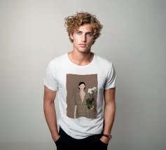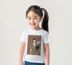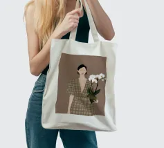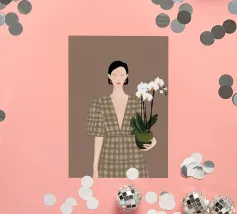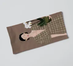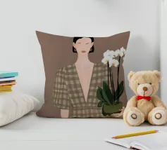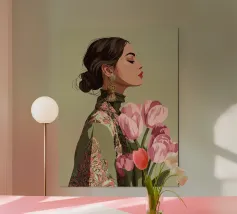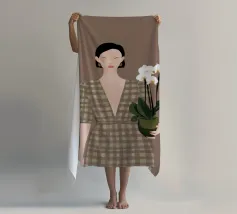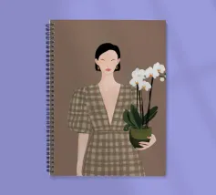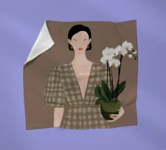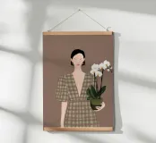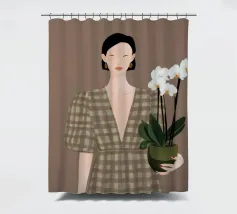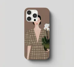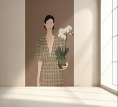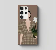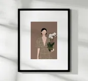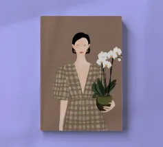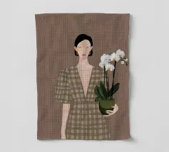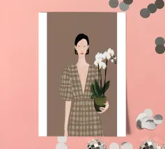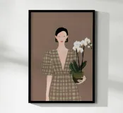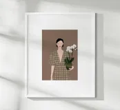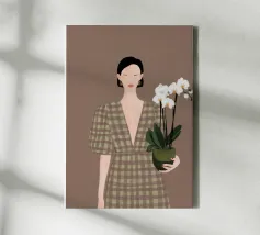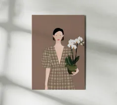 This artwork depicts a person holding a pot of white orchids, dressed in a green checkered dress. The background is brown, complementing the earthy tones of the scene.