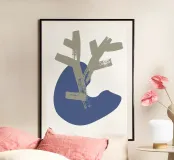 Un disegno minimalista presenta una forma astratta beige a forma di ramo sovrapposta a una forma organica blu. La composizione enfatizza la semplicità e il contrasto su uno sfondo bianco.