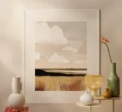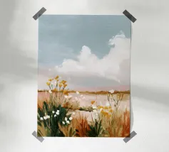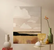 Un paesaggio minimale con nuvole delicate e un orizzonte calmo e aperto.