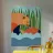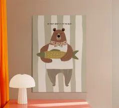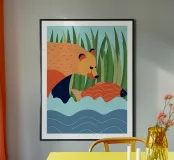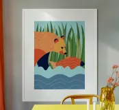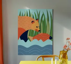 Assistete a un momento epico tra un orso e un pesce in questa splendida illustrazione naturalistica. I colori vivaci e il design minimalista creano un'atmosfera vivace e accattivante.