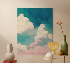 Una scena minimalista vi trasporta in un mondo di pace e armonia. Nuvole rosa e gialle fluttuano in un mare azzurro di nuvole, delicatamente illuminato da una luce soffusa. Le dolci increspature sulla superficie dell'acqua e la fresca tavolozza di colori esaltano l'atmosfera pacifica. Immergetevi in questo mondo da sogno e trovate un momento di relax.