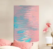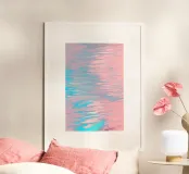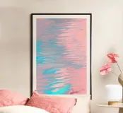 Splendida arte astratta fluida, ispirata a una tranquilla spiaggia rosa, con flussi di colore in blu acqua e rosa pastello.