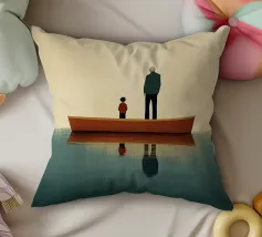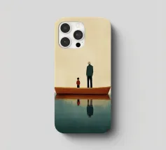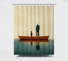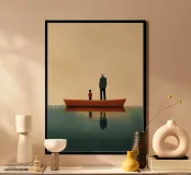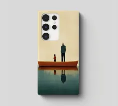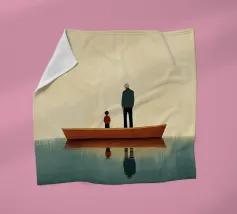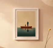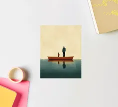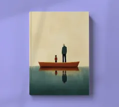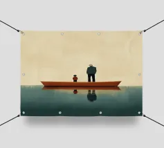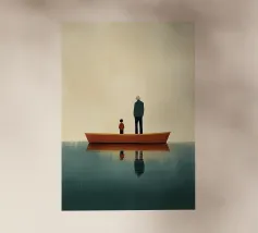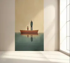 Illustrazione minimalista e piatta di un uomo anziano in piedi sul bordo di una barca con suo figlio. Entrambi guardano lontano dalla macchina fotografica, con uno sfondo semplice e colori tenui che trasmettono un'atmosfera pacifica e serena e un senso di calma nel loro comportamento. L'attenzione è rivolta a catturare espressioni sottili e dettagli che trasmettono profondità senza essere opprimenti o ingombranti. Questo stile riflette il minimalismo scandinavo, pur mantenendo l'intensità emotiva.