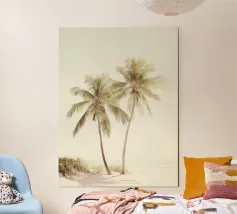 Illustrazione minimalista di due palme contro il cielo, con toni blu tenui e una texture granulosa per un'atmosfera d'altri tempi. Lo sfondo è un cielo blu chiaro con nuvole sottili.