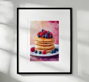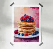 Illustrazione gourmet di una pila di pancake dorati conditi con lamponi, mirtilli e more e irrorati di sciroppo d'acero. Perfetta per una decorazione murale calda e accogliente.