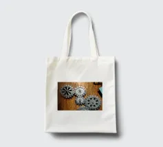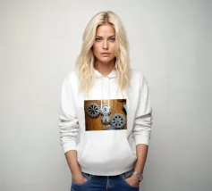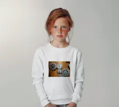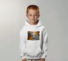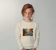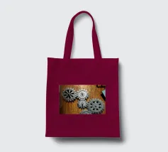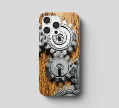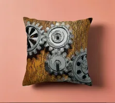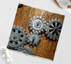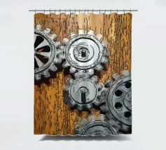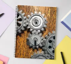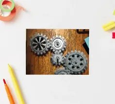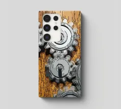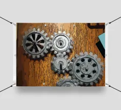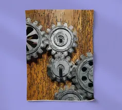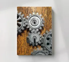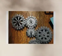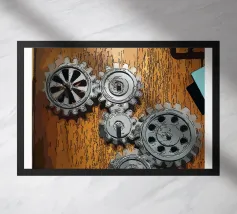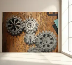 Ingranaggio di ruote dentate meccaniche in movimento fissato su un pannello di legno.