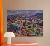 An expansive panoramic landscape depicting a rich tapestry of rolling hills in diverse shades of green, yellow, and subtle purple, marked by patches of trees and cultivated fields, all under a soft, sweeping cloudy sky.