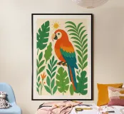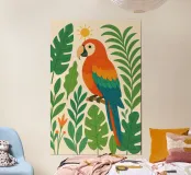 Un pappagallo colorato riposa sul suo ramo, circondato da una vegetazione lussureggiante e da un piccolo sole caldo. Questo allegro poster porta un'atmosfera tropicale e una natura colorata nella stanza dei bambini. Perfetto per i piccoli amanti degli animali e per gli esploratori con la voglia di viaggiare.