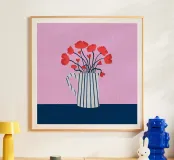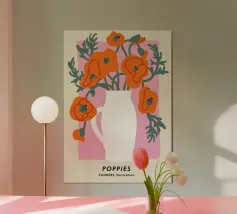 Portate una ventata di fascino ispirato alla natura nel vostro spazio con questa splendida opera d'arte di natura morta che raffigura una brocca a righe piena di vivaci papaveri. Su uno stravagante sfondo punteggiato, questo pezzo contemporaneo fonde la classica bellezza botanica con elementi di design moderno. Il contrasto tra le strisce decise e le morbide forme floreali crea un ritmo visivo accattivante che attira lo sguardo.