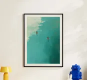 Scivolando fianco a fianco in un mare turchese, due nuotatori tracciano percorsi sincronizzati che si increspano verso l'esterno in archi delicati. Realizzato con audaci pennellate di olio, "Parallel Currents" cattura un tranquillo duetto di movimento e quiete, dove le figure umane e la distesa acquatica si fondono in un sereno balletto di colori e forme.