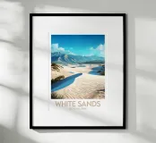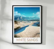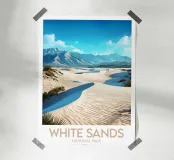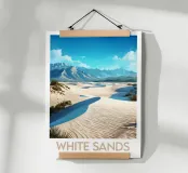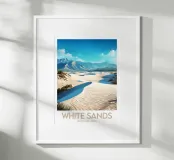 Una suggestiva illustrazione del White Sands National Park, che mette in evidenza le incontaminate dune di sabbia bianca e le ombre morbide che scolpiscono il paesaggio. Un poster da parete perfetto per dare un tocco di luce e minimalismo naturale al vostro arredamento.