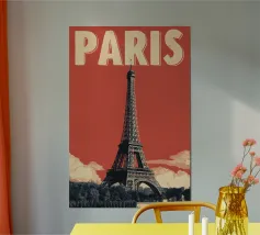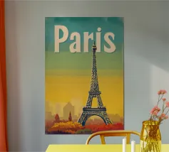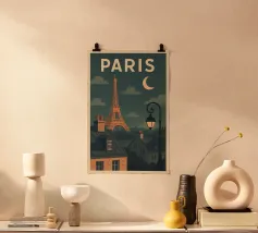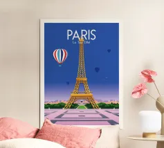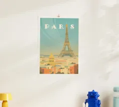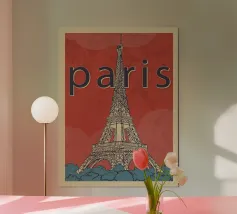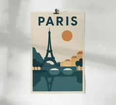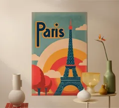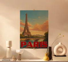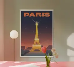 Un poster minimalista e vibrante che cattura tutta la magia di Parigi nell'ora d'oro. La Torre Eiffel si erge elegantemente su una gradazione di viola, rosa e arancione, evocando la poesia di un crepuscolo parigino. Perfetta per un arredamento urbano e chic, questa illustrazione modernizza l'icona francese con stile e morbidezza.