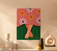 Un'illustrazione stravagante di gambe ornate da calzini rosa a righe e delicati fiori in fiore. Lo sfondo è caratterizzato da giocosi pois neri, che aggiungono un'estetica retrò e moderna. Una fusione di moda e natura, questa opera d'arte emana fascino e creatività.