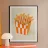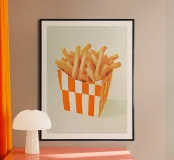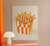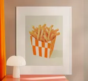 Un'illustrazione creativa di patatine fritte gialle dorate in una scatola a quadretti arancione retrò combina la cultura nostalgica del fast food con un design moderno e minimalista dai colori tenui e pop art. Ideale per qualsiasi cucina!