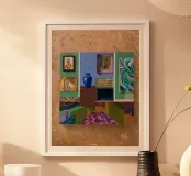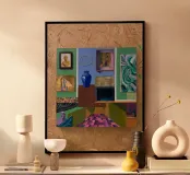 Un'opera d'arte simile a un collage presenta una collezione di dipinti in miniatura incorniciati, diversi motivi ed elementi di natura morta, disposti su uno sfondo strutturato, forse in legno, dalle molteplici tonalità.