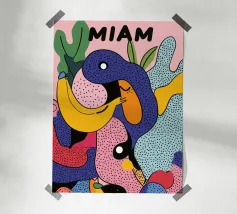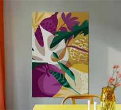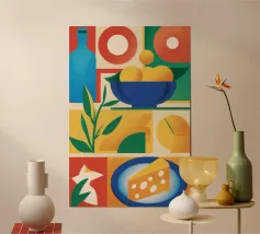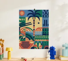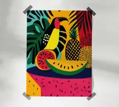 Un audace e dinamico patchwork di forme geometriche, con banane stilizzate e foglie tropicali. La palette di colori vivaci e il forte stile grafico creano una composizione giocosa ed energica.