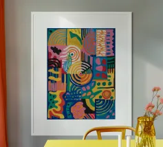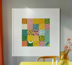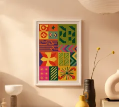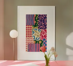Un vivace e gioioso patchwork di vari motivi astratti e colori, tra cui fiori, strisce e forme geometriche, che creano un design tessile vivace ed energico.