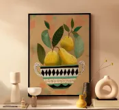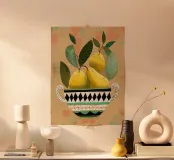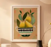 Porta un tocco di freschezza alla tua casa con questa stampa artistica in legno che presenta una ciotola decorata con pere. Perfetta per la cucina o la sala da pranzo, questa opera d'arte vivace ed elegante è un'aggiunta ideale al tuo arredamento.