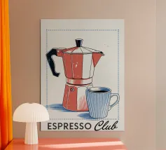 Una vibrante celebrazione della cultura del caffè, questa opera d'arte cattura l'essenza del perfetto rituale mattutino. Con una caffettiera d'ispirazione rétro nelle vivaci tonalità dell'arancione e del rosa, abbinata a una tazza giocosa, è una lettera d'amore visiva agli amanti del caffè di tutto il mondo. I toni caldi e il design stravagante invitano ad assaporare ogni sorso. Perfetto per aggiungere un tocco di colore e personalità a qualsiasi spazio, questo pezzo è un must per chi non può iniziare la giornata senza la sua indispensabile tazza di caffè.