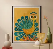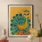 Pavone colorato con piume decorative e viso felice poster con telaio in alluminio