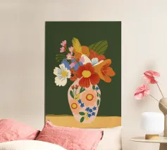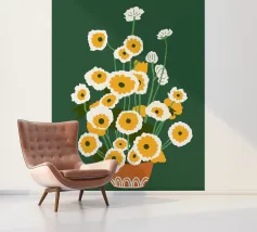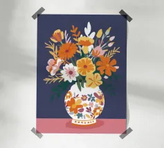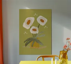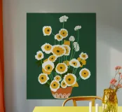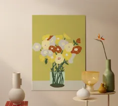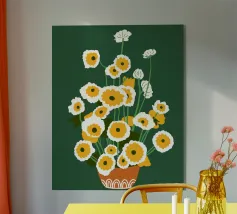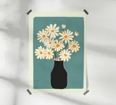 Questa stampa d'arte mostra un vaso marrone pieno di vivaci fiori bianchi e gialli, catturando l'essenza della bellezza naturale. Un pezzo semplice ma elegante che aggiunge un tocco di fascino naturale a qualsiasi spazio.