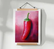 Una vibrante illustrazione di un peperoncino rosso brillante su uno sfondo sfumato di rosso e rosa, che ne cattura l'intensità e la brillantezza. Un poster ideale per una decorazione culinaria moderna e piccante.