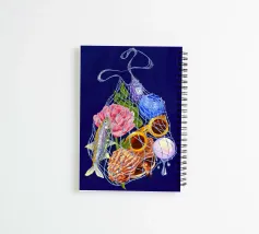Fisherman Haul è un'illustrazione stravagante di un campionario di vacanze al mare, solo l'essenziale in una borsa bilum con i brillantini, per un'evasione perfetta!