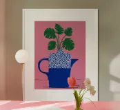 Una moderna natura morta di una pianta verde e frondosa in un vivace vaso blu a pois bianchi. La composizione su uno sfondo rosa è allegra ed elegante e rappresenta un bel tocco di colore e di fantasia.