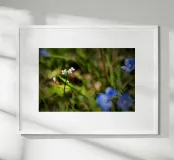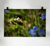 Primo piano di piccoli e delicati fiori di campo bianchi che si stagliano in un prato verde e rigoglioso, con tenui accenni di fiori blu sfocati sullo sfondo. Questa serena fotografia naturalistica porta la calma bellezza della campagna in qualsiasi salotto, camera da letto o ufficio.