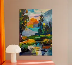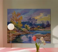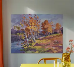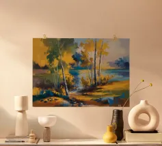 Un dipinto paesaggistico che raffigura un fiume che attraversa un prato, con pini che ne costeggiano le rive. L'erba è gialla e verde, il che fa pensare alla fine dell'estate o all'inizio dell'autunno.