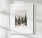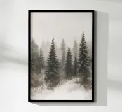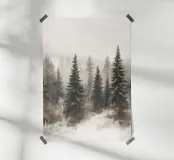 Immergetevi nella tranquilla bellezza di una foresta invernale incontaminata con questo accattivante poster digitale. Questa splendida opera d'arte mostra pini torreggianti che sfumano in una nebbia soffice ed eterea, creando un senso di serena profondità e tranquilla solitudine. Il primo piano è ricoperto di neve bianca incontaminata, con sottili accenni di erbe secche che fanno capolino. La tavolozza dei colori, dominata da grigi freddi, verdi profondi e marroni caldi, cattura perfettamente l'aria frizzante e la luce diffusa di una tranquilla giornata di neve. Questo pezzo è ideale per creare un'atmosfera rilassante e contemplativa in qualsiasi spazio, celebr