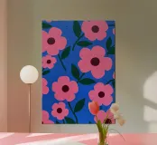 A vibrant, seamless pattern of stylized pink flowers against a dark blue background. The composition is a bold, modern, and beautiful piece of graphic floral design.
