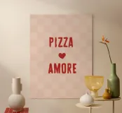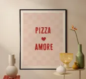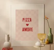 Pizza Amore scritta a mano su un'elegante scatola per pizza a scacchiera beige con scritte rosse. Questo disegno è ideale per la cucina e anche per una fresca maglietta estiva. Perfetto come regalo o per decorare la casa in modo accogliente. Questo poster porta il sapore italiano direttamente a casa vostra ed è ideale per tutti gli appassionati di pizza.
