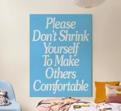 Non rimpicciolire te stesso per mettere a proprio agio gli altri. Questa stampa di forte impatto trasmette un messaggio di autostima e autenticità con un testo bianco scorrevole su un sereno sfondo blu. Un potente promemoria visivo per camere da letto, studi o spazi di benessere, che incoraggia la fiducia in se stessi senza scuse. Ideale come regalo significativo per adolescenti, creativi o chiunque voglia rivendicare il proprio spazio nel mondo. Che si tratti di compleanni, nuovi capitoli o ispirazione quotidiana, questa opera d'arte promuove la presenza, l'orgoglio e il diritto di occupare spazio.