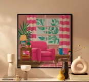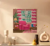 Una scena d'interni con una comoda poltrona rosa su una parete a strisce verticali bianche e rosa. La composizione è chic, moderna e rappresenta un elegante e bellissimo gioco di motivi e colori.