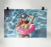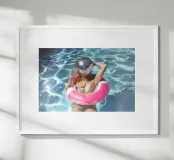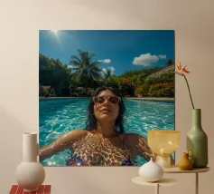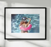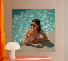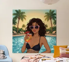 L'immagine cattura una scena giocosa e surreale durante una festa in piscina. Una donna nuota nell'acqua cristallina indossando un casco con una palla da discoteca scintillante che riflette la luce del sole. È sdraiata su un anello gonfiabile rosa e tiene in mano un bicchiere con una bevanda colorata di rosa, che contribuisce a creare un'atmosfera festosa. Il suo costume da bagno è scintillante e si adatta all'atmosfera glamour e divertente della scena. L'acqua intorno a lei luccica e i motivi luminosi danzano sulla sua superficie, contribuendo all'atmosfera vivace e spensierata dell'immagine.