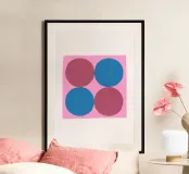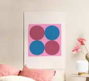 Scoprite l'affascinante semplicità di questa stampa d'arte astratta, che presenta una deliziosa disposizione di quattro grandi cerchi dipinti a mano e leggermente strutturati. Su un audace sfondo quadrato rosa, due cerchi sono resi in una ricca tonalità magenta/rossa, mentre gli altri due sono in un vibrante blu. La texture organica aggiunge un tocco artigianale unico, creando un senso di modernismo giocoso che ricorda la Pop Art contemporanea o l'estetica grezza di David Shrigley. Quest'opera d'arte è perfetta per aggiungere un tocco di colore gioioso e contemporaneo a qualsiasi spazio. Realizzata con eccezionale precisione digitale,